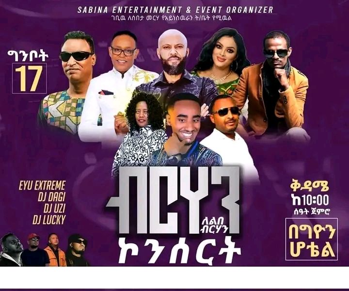 – “ልበ ብርሀን” ርዕስ ያነገበው ኮንሰርት የፊታችን ቅዳሜ ግንቦት 17/2016 ከ 10:00 ጀምሮ በጊዮን ሆቴል ይከናወናል ተብሎ ይጠበቃል ፡፡ በዝግጅቱም አብዱ ኪያር ፣ ሐይማኖት ግርማ ፣ ዩሱፍ ቀመር ፣ ባልከም ዓለሙ ፣ በኩረዓማኑኤል የማነ(ቤኪ)ን ጨምሮ የሙዚቃ ዝግጅታቸውን ያቀርባሉ ተብሎ ይጠበቃል፡፡