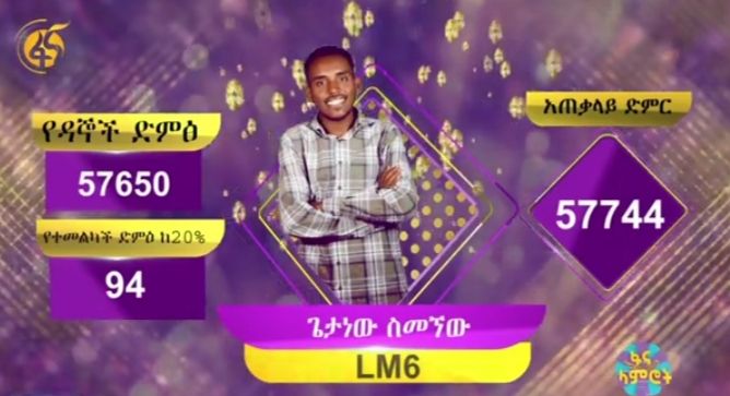 የእለቱ ተሰናባች ጌታነው ስመኝ-57744 አጠቃላይ ነጥብ፡፡ በፋና ላምሮት አብሮነቱን ገልፆ ከ5000 ብር ጋር አሰናብቶታል፡፡