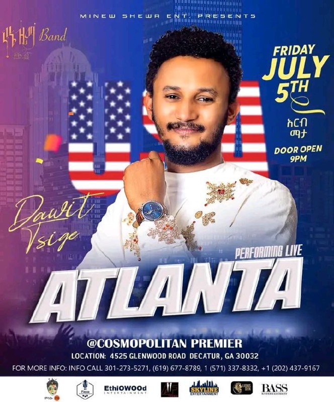 – ዳዊት ፅጌ-  ወደ አሜሪካ ተጎዞ የሙዚቃ ስራውን በአትላታ july 05/2024 ለማቅረብ እየተዘጋጀ ይገኛል፡፡ ድምፃዊ ዳዊት ፅጌ ከ የኔ ዜማ ባንድ ጋር ሙሉ ዝግጅቱን እንዳጠናቀቀ እና ከምነው ሸዋ ኢንተርቴመንት ጋር በመተባበር ወደ አሜሪካ ተጉዘው የሙዚቃ ስራዎቻቸውን ሊያቀርቡ መሆኑንም ገልጿል፡፡