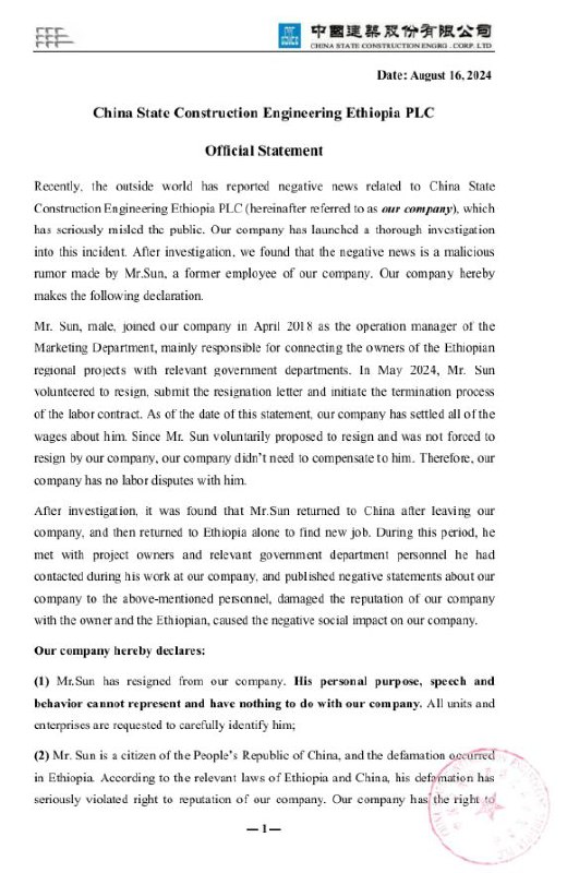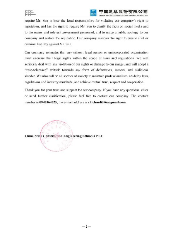 የቻይና መንግስት ኮንስትራክሽን ኢንጅነሪንግ ኢትዮጵያ ኃ/የተ/የግ/ማህበር ከሰሞኑ እየተናፈሰብኝ ነው ላለው ውዝግብ መግለጫ ሰጠ ።