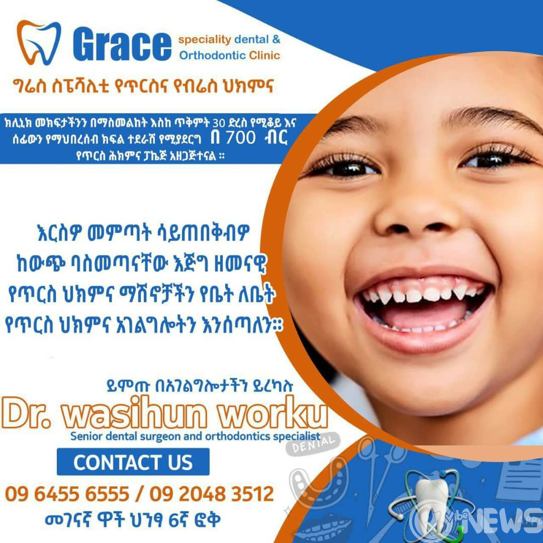 ክሊኒካችን ግሬስ ስፔሻሊቲ የጥርስና የብሬስ ህክምና ክሊኒክ ከጥቅምት 8/2017 ዓ.ም.በአዲስ አበባ መገናኛ – ዋች ህንፃ 6ኛ ፎቅ ላይ መከፈቱን በማስመልከት እስከ ጥቅምት 30/2017 ዓ.ም.ድረስ የሚቆይና ሰፊውን የማህበረሰብ ክፍል ተደራሽ የሚያደርግ በ”700 ብር ብቻ” የጥርስ ህክምና ፓኬጅ አዘጋጅቷል።